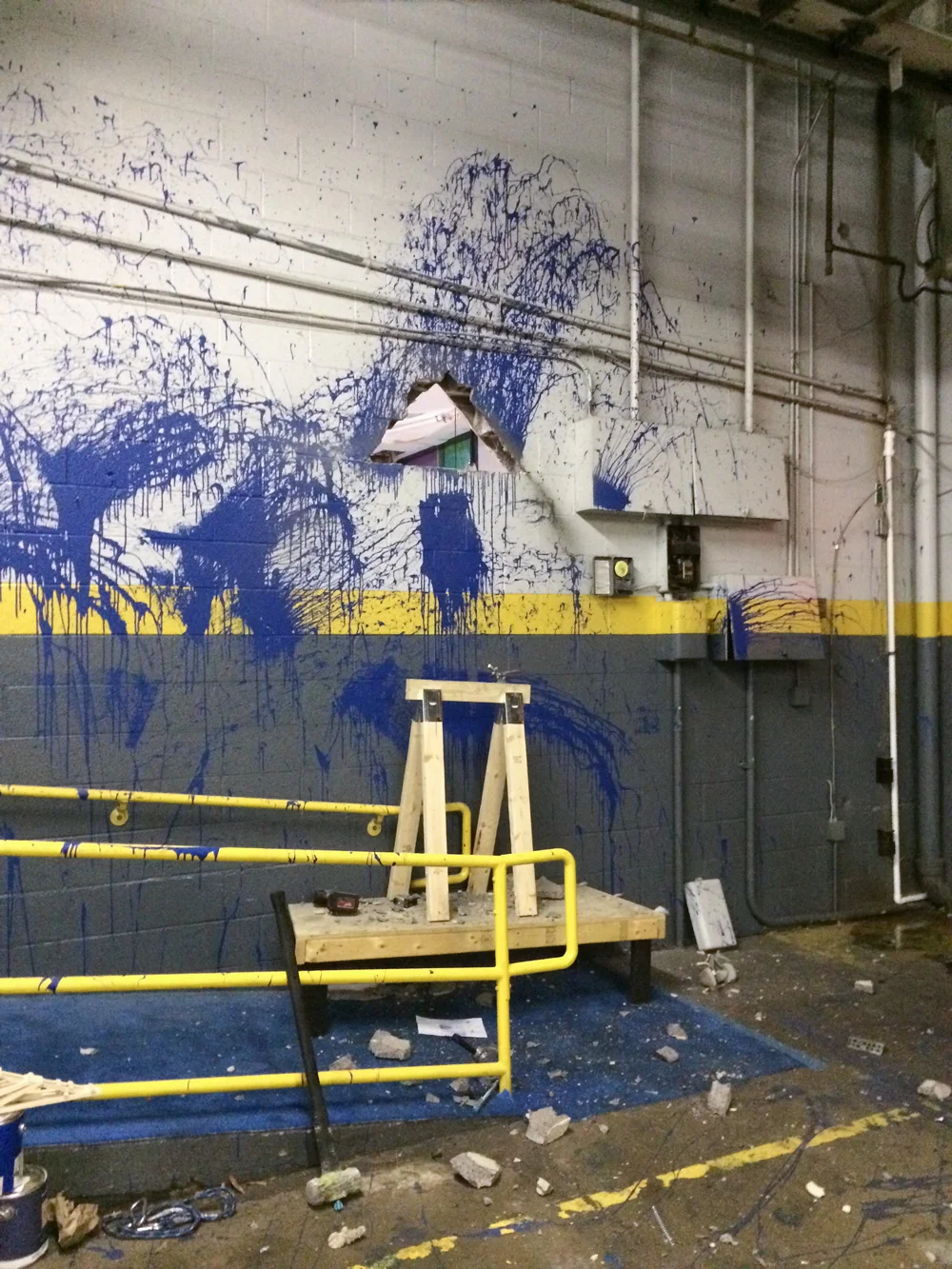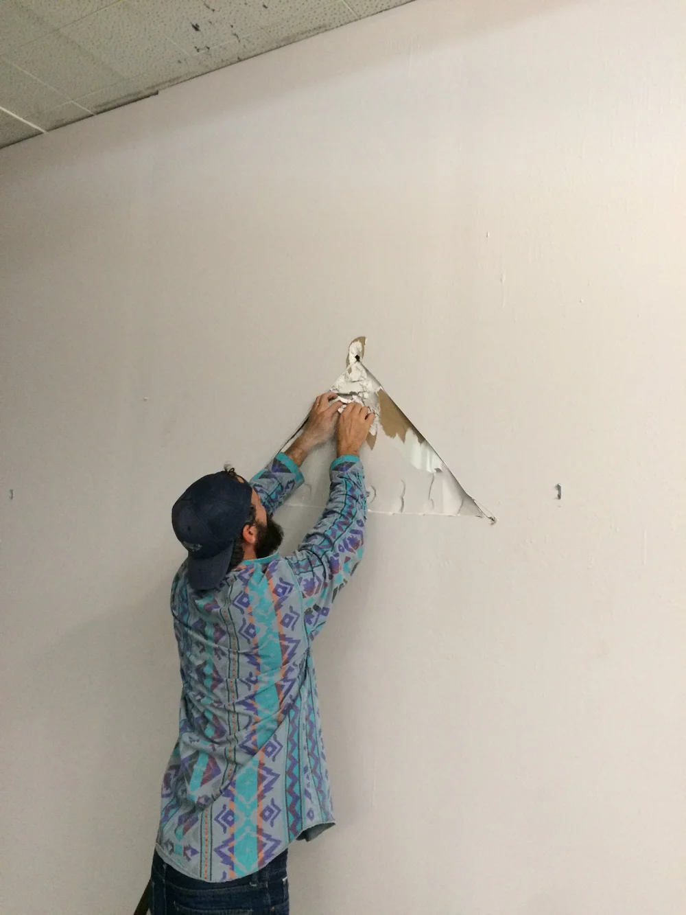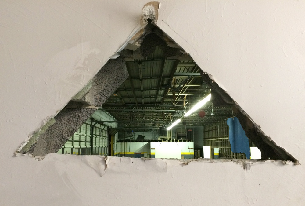 Once the four points were identified on the opposite side of the wall, we connected the dots, removed the drywall with a boxcutter, then used up more cutoff disks to score the cinder blocks on the gallery side.